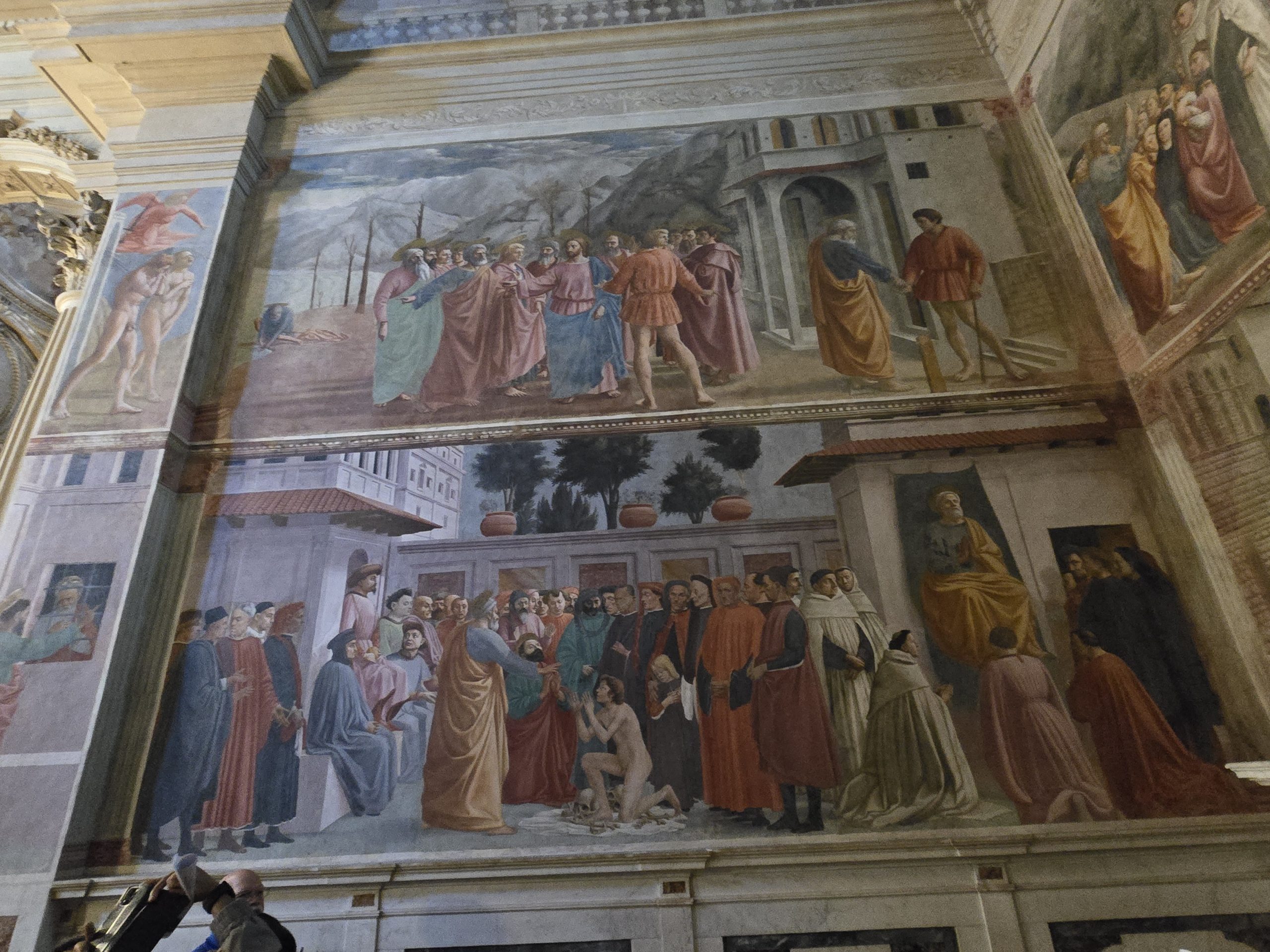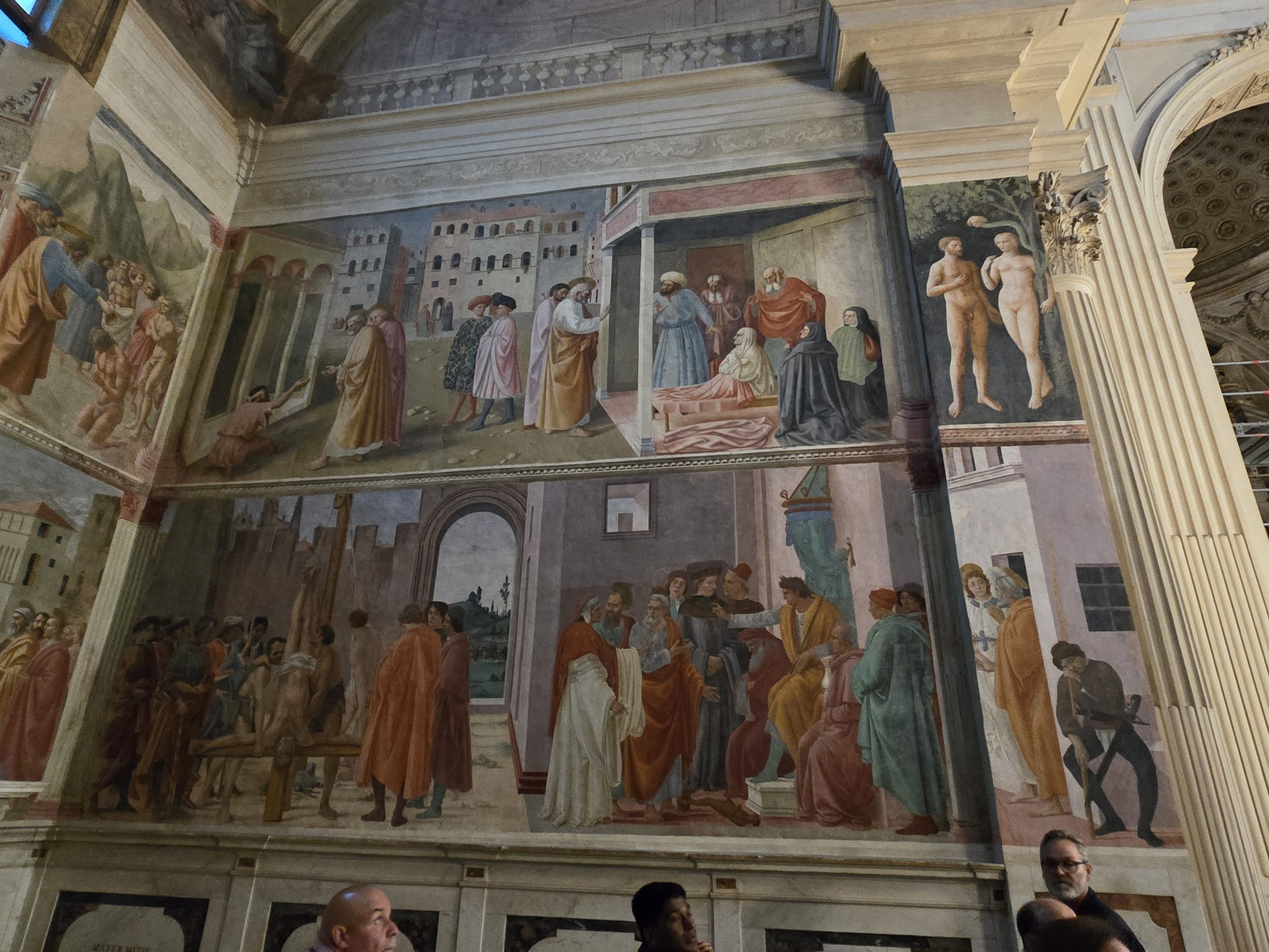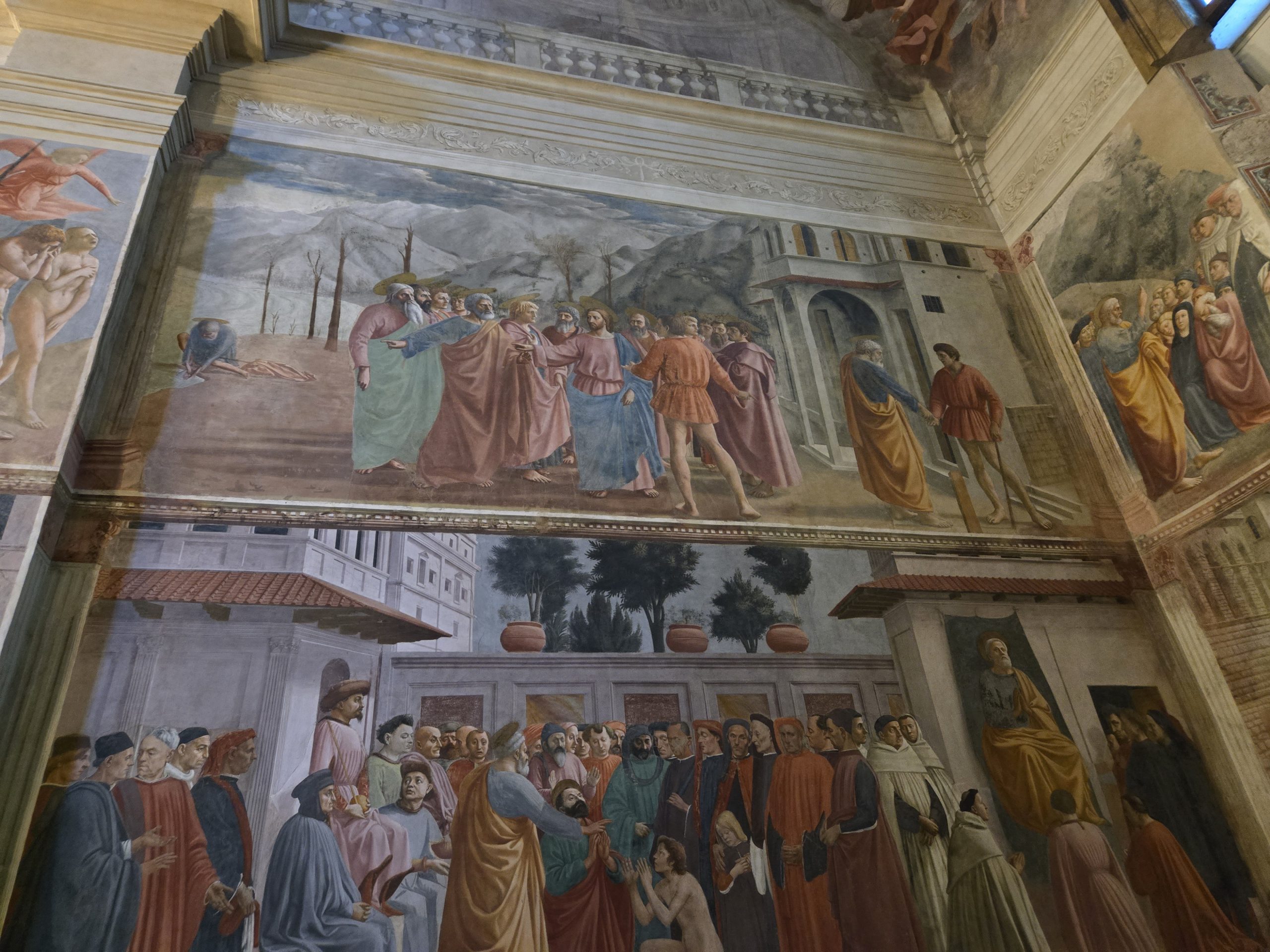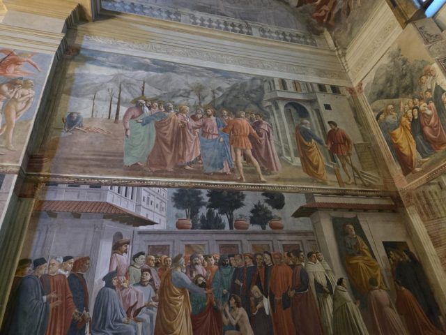 The mastery that went into the paintings in the Brancacci Chapel is deep. Upon entering the chapel, on the right pillar, Adam and Eve are depicted in the Garden of Eden before the fall … strong, robust, and shameless in the eyes of one another and God. The left pillar, however, depicts Adam and Eve after the fall … and their appearance is markedly different; Adam, who had a robust gym-bod – is now depicted as a man who works the earth … and whose body is showing the pains of that. Similarly, Eve has shame about her … and is not as beautiful and fit as she was before the fall. The various images within the chapel incorporate perspective (which was a new technique at the time these paintings were done). Refer to the PDF from Fr. Edward Linton for complete details on the intricacies of the Brancacci Chapel.