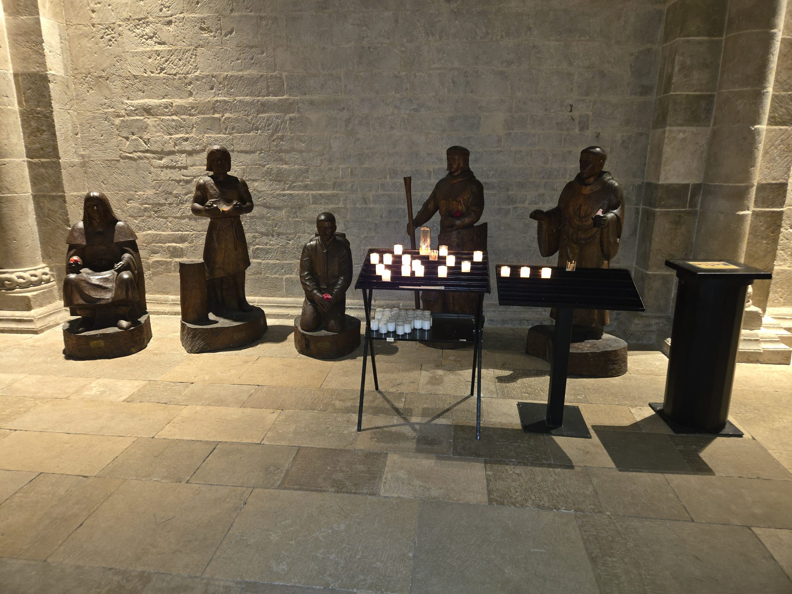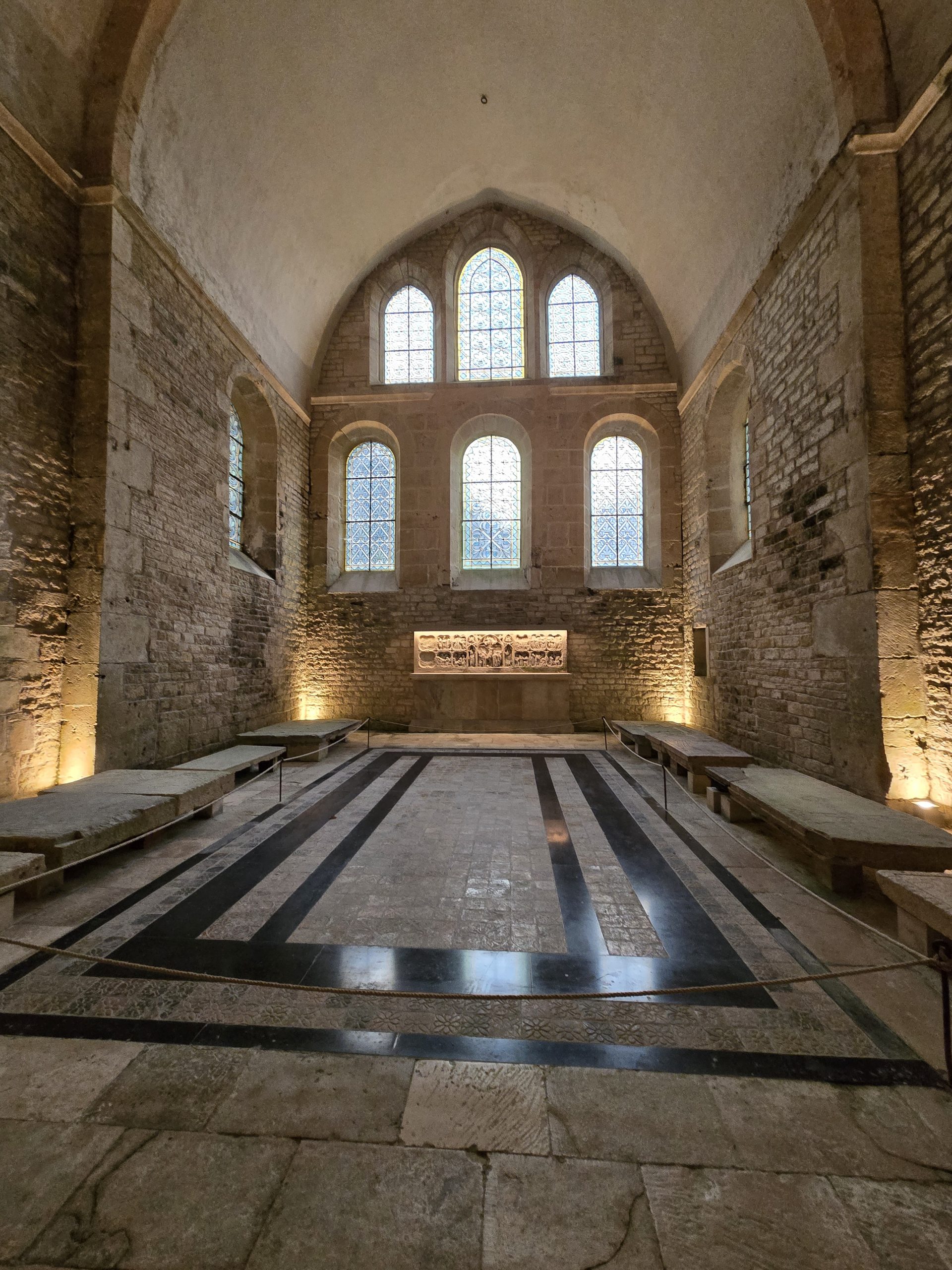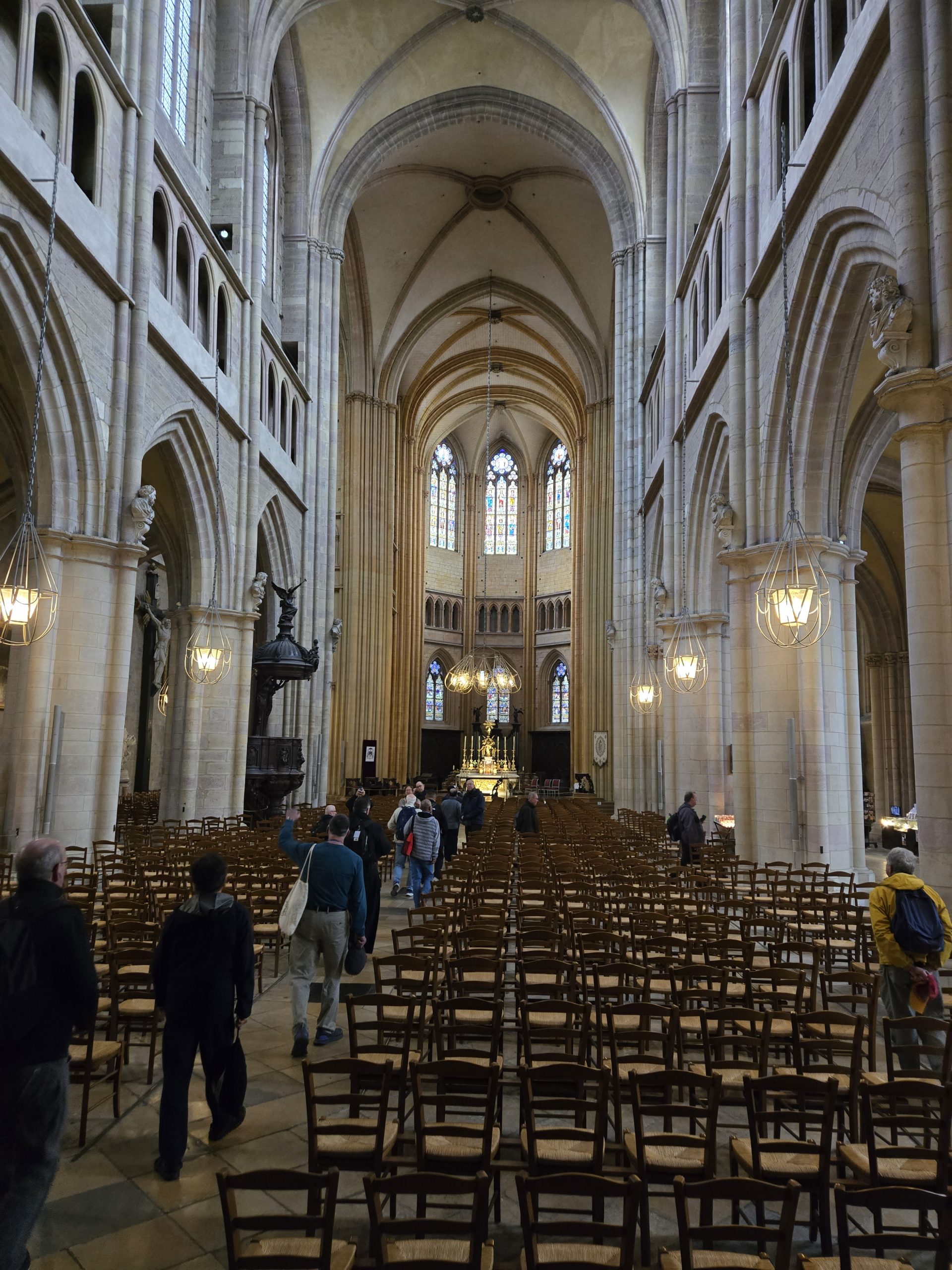 | Our first stop on Monday, 11 November 2025, was at the Cathédrale of Saint-Bénigne which tells two stories at once: the high, patterned roofs and spire that mark Dijon’s skyline, and the older circle below where the city keeps its first memory of the place. Beneath the Gothic shell lies the year-1000 rotunda’s crypt, reopened in 2024 after years of careful work, which makes the building read from bottom up: early medieval martyrium, 13th- to 14th-century church, modern city around it. In 1792 the abbey church became the cathedral as Revolutionary reforms remapped the Church. |