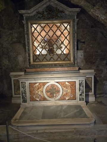The Mamertine Prison is Rome’s oldest prison, for many centuries a maximum security penitentiary for the enemies of Rome awaiting execution. Here, according to tradition, the Apostles Peter and Paul lived their last days before being executed: Peter at the Circus of Nero in the area of the Vatican Hill, and; Paul, towards the Aquae Salviae, on the Via Laurentina. Originally the complex was much larger, but now only two cells and part of the facade remain. The cell consisted of an upper section (Carcer) and a lower section (Tullianum). The Tullianum was probably built in the 3rd century BC and was connected to the Carcer with a hole. The Tullianum was used as a death row. Prisoners were let down through the hole in the ceiling and executed on this death row. In the end, the bodies were transported via the Tiber River. The prison was in use until the 4th century and in the 16th century the church of San Giuseppe dei Falegnami was built on top of the Mamertine prison. The name Mamertine is probably derived from the Latin “Mamertinus”, referring to the god of war Mars and his nearby altar. |