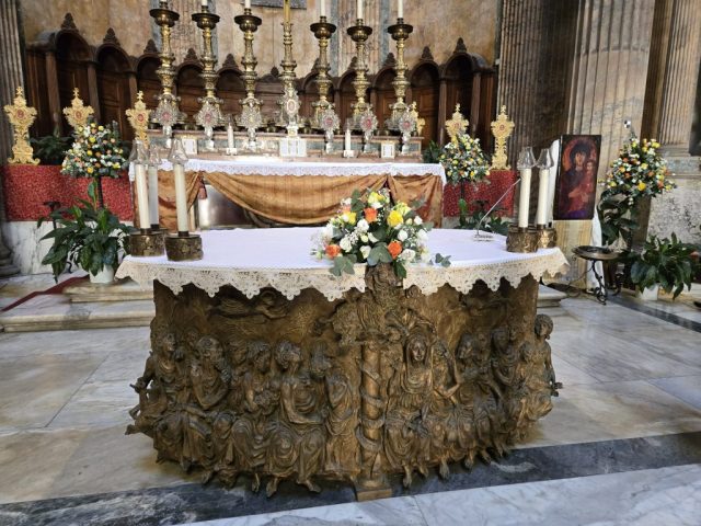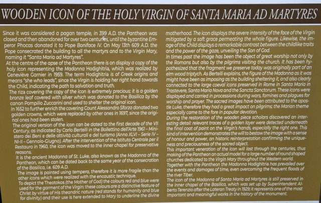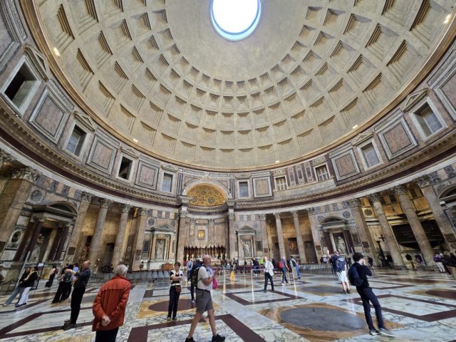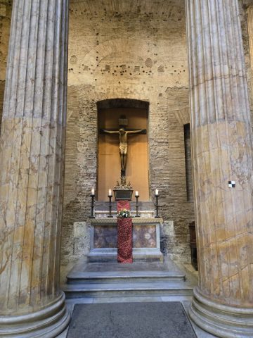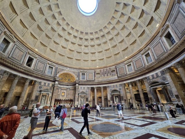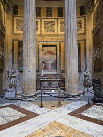 On the day of its consecration, 28 wagons of martyrs’ were transported there; the relics were taken from various cemeteries. This event is the origin of All Saints Day, instituted by Pope Gregory IV in the 9th century. (Note: The day of its consecration was in 609.) This act of consecration was an impressive statement of Christianity’s definitive triumph over pagan Rome.